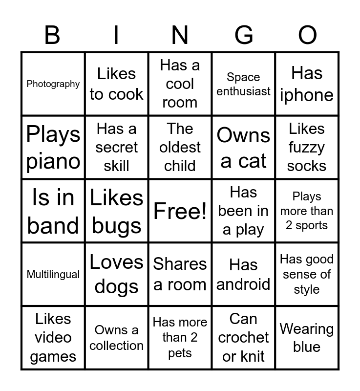 This bingo card has a free space and 24 words: Loves dogs, Owns a collection, The oldest child, Likes video games, Has iphone, Photography, Plays piano, Likes to cook, Has been in a play, Shares a room, Owns a cat, Is in band, Has android, Has good sense of style, Has a secret skill, Can crochet or knit, Plays more than 2 sports, Has a cool room, Likes fuzzy socks, Likes bugs, Wearing blue, Multilingual, Space enthusiast and Has more than 2 pets.