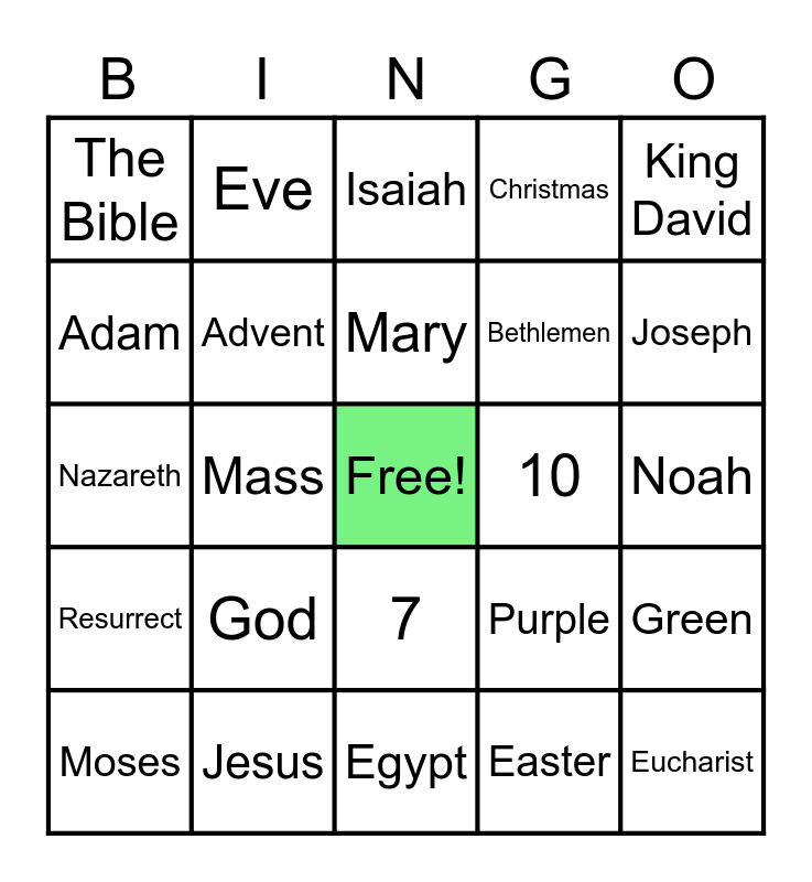 This bingo card has a free space and 24 words: God, Jesus, Mary, Moses, King David, The Bible, Adam, Eve, 10, 7, Bethlemen, Nazareth, Purple, Green, Advent, Easter, Noah, Isaiah, Joseph, Mass, Eucharist, Resurrect, Christmas and Egypt.