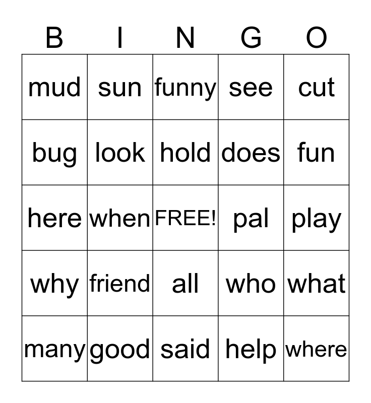 This bingo card has a free space and 24 words: friend, good, hold, many, cut, mud, bug, sun, pal, all, does, here, who, what, look, help, play, funny, fun, when, where, why, see and said.