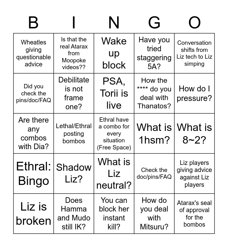 This bingo card has a free space and 24 words: Shadow Liz?, Does Hamma and Mudo still IK?, PSA, Torii is live, Liz is broken, Conversation shifts from Liz tech to Liz simping, Wheatles giving questionable advice, Did you check the pins/doc/FAQ, Is that the real Atarax from Moopoke videos??, What is 1hsm?, What is Liz neutral?, How the **** do you deal with Thanatos?, Are there any combos with Dia?, Check the doc/pins/FAQ, Liz players giving advice against Liz players, Debilitate is not frame one?, How do you deal with Mitsuru?, What is 8~2?, Wake up block, How do I pressure?, Lethal/Ethral posting bombos, Atarax's seal of approval for the bombos, Ethral: Bingo, Have you tried staggering 5A? and You can block her instant kill?.