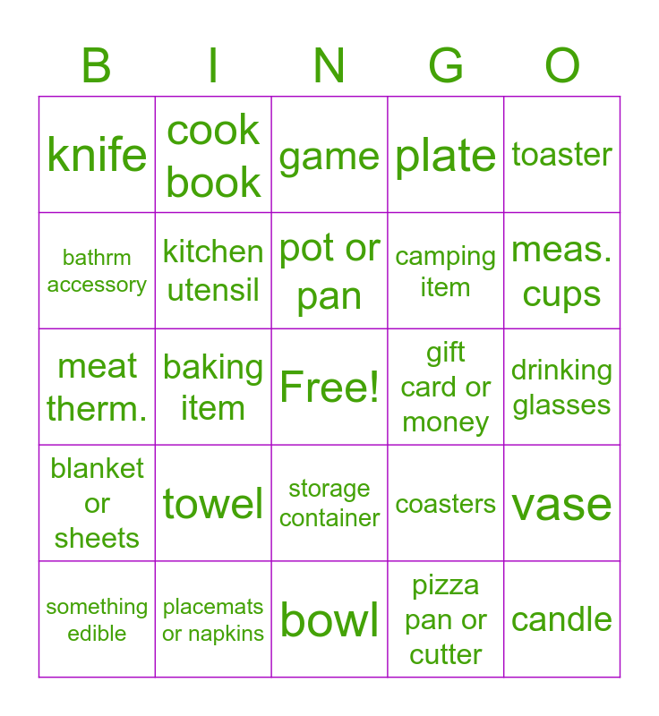 This bingo card has a free space and 29 words: something edible, artwork, baking item, photo album, knife, game, kitchen utensil, towel, gift card or money, placemats or napkins, drinking glasses, candle, bowl, pizza pan or cutter, meas. cups, picture frame, storage container, blanket or sheets, toaster, meat therm., coasters, cutting board, camping item, bathrm accessory, plate, cook book, vase, pot or pan and hand mixer.