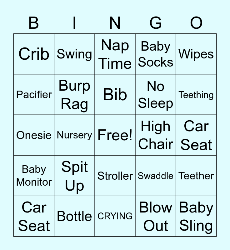 This bingo card has a free space and 24 words: Spit Up, Bottle, Bib, Car Seat, Wipes, Crib, Pacifier, Swing, High Chair, Stroller, No Sleep, Onesie, Swaddle, Teether, Burp Rag, Blow Out, Car Seat, Nap Time, Teething, Nursery, Baby Sling, Baby Monitor, Baby Socks and CRYING.