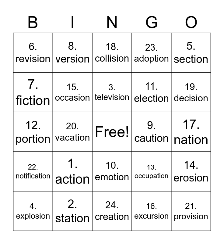 This bingo card has a free space and 24 words: 1. action, 2. station, 3. television, 4. explosion, 5. section, 6. revision, 7. fiction, 8. version, 9. caution, 10. emotion, 11. election, 12. portion, 13. occupation, 14. erosion, 15. occasion, 16. excursion, 17. nation, 18. collision, 19. decision, 20. vacation, 21. provision, 22. notification, 23. adoption and 24. creation.