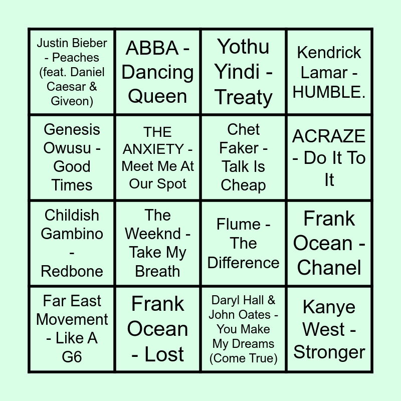 This bingo card has 62 words: Lil Nas X - MONTERO (Call Me By Your Name), Client Liaison - World Of Our Love, Kendrick Lamar - King Kunta, Kanye West - Stronger, Nelly Furtado - Maneater, Touch Sensitive - Lay Down, Chet Faker - Talk Is Cheap, M83 - Midnight City, Childish Gambino - Redbone, Disclosure - Latch, Kendrick Lamar - HUMBLE., Arctic Monkeys - Why'd You Only Call Me When You're High?, THE ANXIETY - Meet Me At Our Spot, The Weeknd - Blinding Lights, Riton - Friday (feat. Mufasa & Hypeman) - Dopamine Re-Edit, Justin Bieber - Peaches (feat. Daniel Caesar & Giveon), Far East Movement - Like A G6, Genesis Owusu - Good Times, Elton John - Cold Heart - PNAU Remix, ACRAZE - Do It To It, Frank Ocean - Lost, Yothu Yindi - Treaty, bbno$ - edamame (feat. Rich Brian), Luude - Down Under (feat. Colin Hay), The Wiggles - Elephant - triple j Like A Version, Mac Miller - The Spins, Savage Garden - Truly Madly Deeply, Oliver Tree - Life Goes On, A-Wall - Loverboy, Disclosure - You & Me - Flume Remix, Majestic - Rasputin, Mura Masa - Love$ick, Faith No More - Easy, Stardust - Music Sounds Better With You, Daryl Hall & John Oates - You Make My Dreams (Come True), ABBA - Dancing Queen, Vance Joy - Riptide, The Presets - Downtown Shutdown, Frank Ocean - Chanel, NEIL FRANCES - Music Sounds Better with You, Flume - The Difference, Estelle - American Boy, Glass Animals - Heat Waves (with iann dior), Bruno Mars - Smokin Out The Window, The Weeknd - Take My Breath, Kim Carnes - Bette Davis Eyes, Metro Station - Shake It, Nelly Furtado - Say It Right, Kanye West - Flashing Lights, Vanessa Carlton - A Thousand Miles, Owl City - Fireflies, Marvin Gaye - Sexual Healing, Cold Chisel - Flame Trees - 2011 Remastered, Red Hot Chili Peppers - Can't Stop, Go West - The King of Wishful Thinking, a-ha - Take on Me, Vampire Weekend - A-Punk, Third Eye Blind - Semi-Charmed Life, Cher - Believe, Jack Harlow - First Class, Elton John - Cold Heart - PNAU Remix and WILLOW - Wait a Minute!.