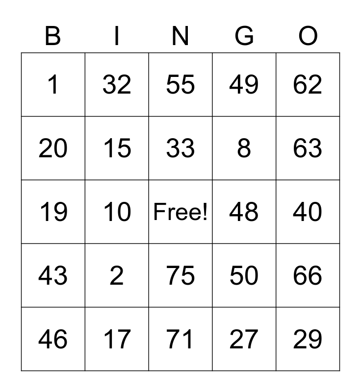 This bingo card has a free space and 24 words: 2, 17, 33, 46, 62, 1, 20, 32, 48, 75, 8, 19, 50, 66, 15, 27, 40, 55, 63, 10, 29, 43, 49 and 71.
