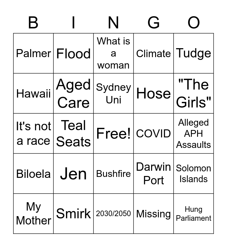 This bingo card has a free space and 24 words: Jen, Smirk, Sydney Uni, My Mother, Tudge, Palmer, Hawaii, Flood, COVID, Bushfire, Hose, It's not a race, Darwin Port, Solomon Islands, Aged Care, Missing, Alleged APH Assaults, What is a woman, "The Girls", Teal Seats, Hung Parliament, Biloela, Climate and 2030/2050.