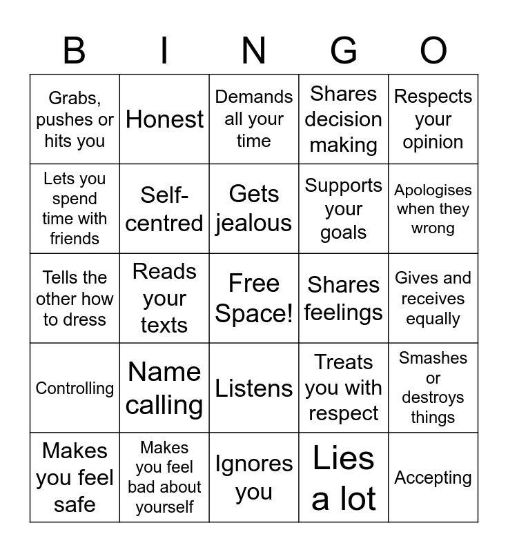 This bingo card has a free space and 24 words: Name calling, Makes you feel bad about yourself, Gets jealous, Makes you feel safe, Respects your opinion, Grabs, pushes or hits you, Lets you spend time with friends, Honest, Shares feelings, Listens, Supports your goals, Tells the other how to dress, Treats you with respect, Smashes or destroys things, Self- centred, Lies a lot, Gives and receives equally, Demands all your time, Apologises when they wrong, Reads your texts, Accepting, Controlling, Shares decision making and Ignores you.