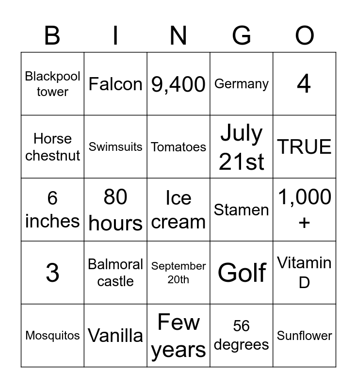 This bingo card has 25 words: Balmoral castle, Few years, Tomatoes, Mosquitos, 4, Blackpool tower, Horse chestnut, Falcon, Stamen, September 20th, July 21st, 6 inches, Golf, Vitamin D, Swimsuits, Sunflower, 1,000 +, 9,400, TRUE, 80 hours, Ice cream, Vanilla, 3, Germany and 56 degrees.