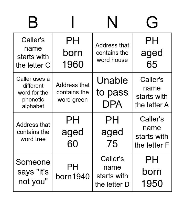 This bingo card has 27 words: Free!, Address that contains the word close, Address that contains the word tree, Address that contains the word crescent, Address that contains the word green, Address that contains the word house, PH born 1960, PH born 1950, PH born1940, PH born 1930, PH aged 75, PH aged 65, PH aged 55, PH aged 70, PH aged 60, Calling the wrong office, Unable to pass DPA, Caller's name starts with the letter A, Caller's name starts with the letter B, Caller's name starts with the letter C, Caller's name starts with the letter D, Caller's name starts with the letter E, Caller's name starts with the letter F, Someone says "it's not you", You get a named TP, Caller uses a different word for the phonetic alphabet and You are placed on hold.