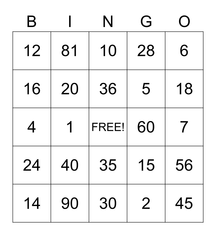 This bingo card has a free space and 29 words: 14, 3, 1, 25, 12, 10, 20, 40, 60, 90, 7, 45, 30, 2, 18, 8, 35, 24, 6, 4, 15, 9, 5, 16, 28, 81, 56, 36 and 21.