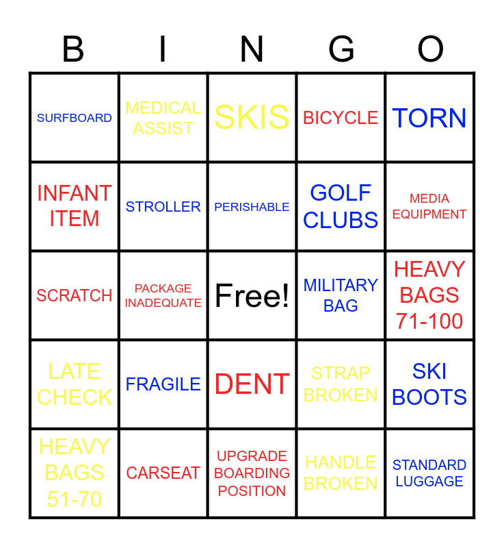 This bingo card has a free space and 24 words: FRAGILE, CARSEAT, PERISHABLE, HEAVY BAGS 51-70, TORN, SURFBOARD, INFANT ITEM, MEDICAL ASSIST, MILITARY BAG, DENT, GOLF CLUBS, SCRATCH, STRAP BROKEN, SKI BOOTS, STROLLER, HANDLE BROKEN, HEAVY BAGS 71-100, SKIS, MEDIA EQUIPMENT, PACKAGE INADEQUATE, STANDARD LUGGAGE, LATE CHECK, BICYCLE and UPGRADE BOARDING POSITION.