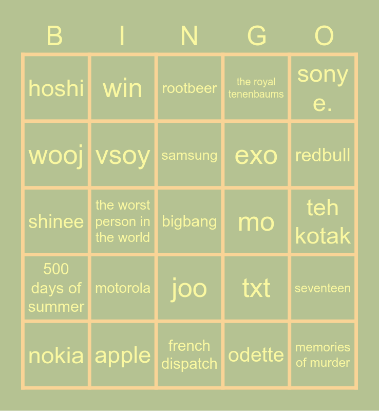 This bingo card has a free space and 24 words: motorola, apple, samsung, nokia, sony e., hoshi, wooj, win, mo, joo, exo, shinee, txt, seventeen, vsoy, odette, teh kotak, rootbeer, redbull, the worst person in the world, memories of murder, 500 days of summer, the royal tenenbaums and french dispatch.