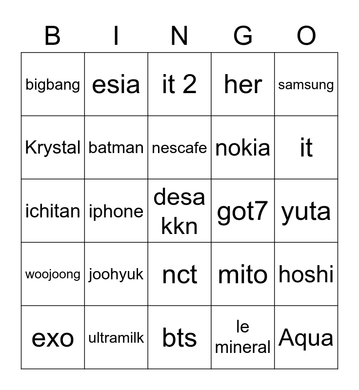 This bingo card has 25 words: joohyuk, bts, nescafe, exo, samsung, bigbang, Krystal, esia, got7, nct, nokia, ichitan, mito, hoshi, batman, Aqua, yuta, it 2, it, iphone, desa kkn, ultramilk, woojoong, her and le mineral.