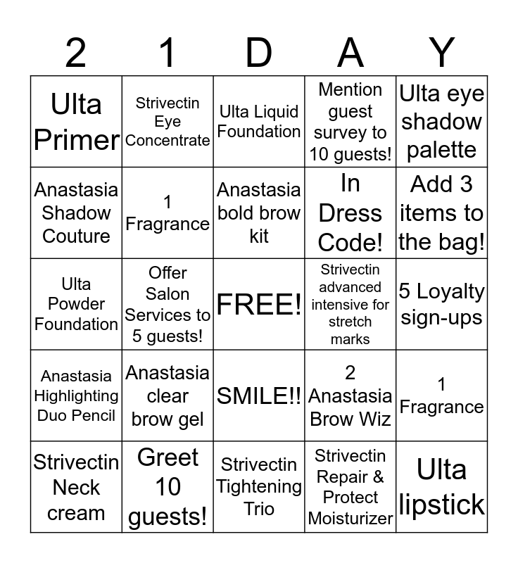 This bingo card has a free space and 24 words: Anastasia clear brow gel, Greet 10 guests!, Anastasia bold brow kit, Strivectin Neck cream, Ulta eye shadow palette, Ulta Primer, Anastasia Shadow Couture, Strivectin Eye Concentrate, Strivectin advanced intensive for stretch marks, SMILE!!, In Dress Code!, Ulta Powder Foundation, 2 Anastasia Brow Wiz, 1 Fragrance, 1 Fragrance, Strivectin Repair & Protect Moisturizer, 5 Loyalty sign-ups, Ulta Liquid Foundation, Add 3 items to the bag!, Offer Salon Services to 5 guests!, Ulta lipstick, Anastasia Highlighting Duo Pencil, Mention guest survey to 10 guests! and Strivectin Tightening Trio.