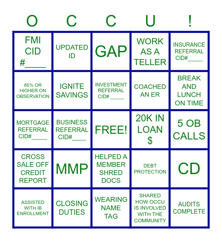 This bingo card has a free space and 24 words: MMP, CLOSING DUTIES, INVESTMENT REFERRAL CID# _____, ASSISTED WITH IB ENROLLMENT, INSURANCE REFERRAL CID#_____, FMI CID #____, 85% OR HIGHER ON OBSERVATION, UPDATED ID, 20K IN LOAN $, HELPED A MEMBER SHRED DOCS, COACHED AN ER, MORTGAGE REFERRAL CID#_____, DEBT PROTECTION, CD, IGNITE SAVINGS, SHARED HOW OCCU IS INVOLVED WITH THE COMMUNITY, 5 OB CALLS, GAP, BREAK AND LUNCH ON TIME, BUSINESS REFERRAL CID#____, AUDITS COMPLETE, CROSS SALE OFF CREDIT REPORT, WORK AS A TELLER and WEARING NAME TAG.