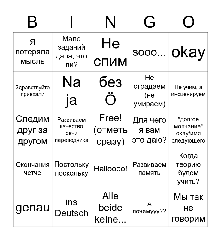 This bingo card has a free space and 24 words: Постольку поскольку, ins Deutsch, без Ö, genau, okay, Я потеряла мысль, Здравствуйте приехали, Мало заданий дала, что ли?, Для чего я вам это даю?, Halloooo!, Не страдаем (не умираем), Следим друг за другом, Развиваем память, Когда теорию будем учить?, Na ja, А почемууу??, *долгое молчание* okay/имя следующего, Не спим, Не учим, а инсценируем, Развиваем качество речи переводчика, Мы так не говорим, Окончания четче, sooo... and Alle beide keine....