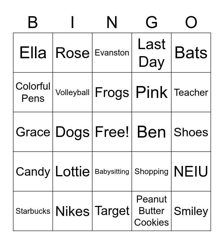 This bingo card has a free space and 24 words: Lottie, Nikes, Frogs, Starbucks, Bats, Ella, Colorful Pens, Rose, Ben, Babysitting, Pink, Grace, Shopping, NEIU, Volleyball, Peanut Butter Cookies, Shoes, Evanston, Teacher, Dogs, Smiley, Candy, Last Day and Target.