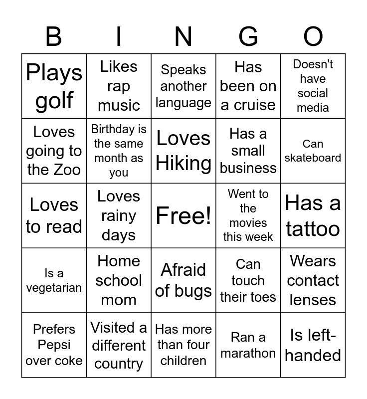 This bingo card has a free space and 44 words: Born in another country, Is left-handed, Doesn't like chocolate, Prefers Pepsi over coke, Has never broken a bone, Ran a marathon, Speaks another language, Plays a musical instrument, Doesn't have social media, Visited a different country, Has been on a cruise, Went to the movies this week, Afraid of bugs, Home school mom, Works from home, Has more than four children, Has green eyes, Loves to read, Has a younger sibling, Can skateboard, Likes rap music, Lives in the country, Has blue eyes, Plays golf, Has two or more brothers, Has a tattoo, Has a dog, Is a twin, Can touch their toes, Is a vegetarian, Doesn't drink coffee, Wears contact lenses, Loves the beach, Loves naps, Loves rainy days, Loves Disney, Likes to ride rollercoasters, Prefers Coke over Pepsi, Loves Hiking, Loves going to the Zoo, Has a small business, Has a garden, Birthday is the same month as you and Is a middle child.