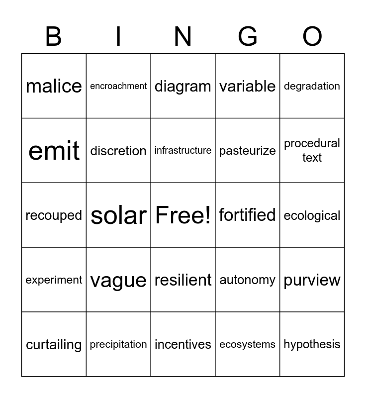 This bingo card has a free space and 24 words: vague, precipitation, infrastructure, curtailing, degradation, malice, emit, encroachment, fortified, resilient, pasteurize, recouped, autonomy, purview, discretion, ecosystems, ecological, diagram, procedural text, solar, hypothesis, experiment, variable and incentives.