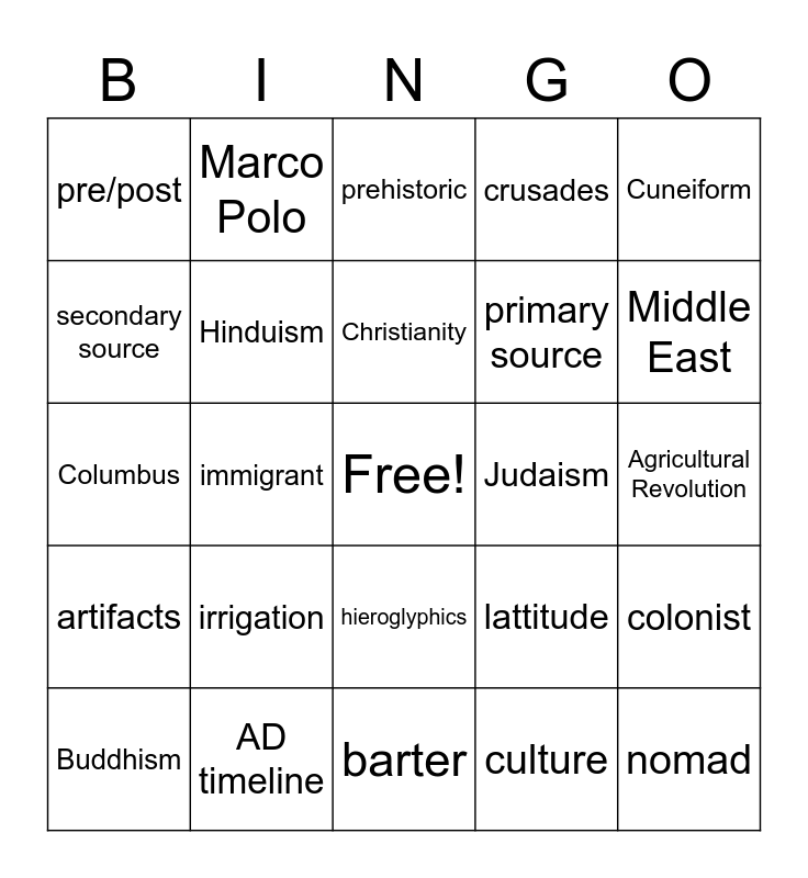 This bingo card has a free space and 34 words: Mesopotamia, culture, adapt, Middle East, artifacts, Hinduism, Cuneiform, Buddhism, Marco Polo, hemisphere, Christianity, prehistoric, Islam, feudal system, Judaism, Middle East, AD timeline, Columbus, irrigation, lattitude, hieroglyphics, longitude, pre/post, Agricultural Revolution, barter, nomad, crusades, melting pot, primary source, secondary source, naturalization, immigrant, colonist and Jamestown, Virginia.
