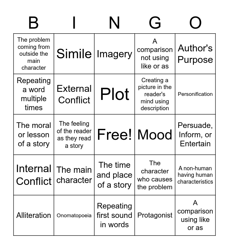 This bingo card has a free space and 34 words: Theme, Protagonist, Antagonist, Setting, Internal Conflict, External Conflict, Author's Purpose, Alliteration, Simile, Metaphor, Plot, Imagery, Repetition, Rhyme, Mood, Personification, Onomatopoeia, The moral or lesson of a story, The main character, The character who causes the problem, The time and place of a story, The problem coming from inside the main character's min, The problem coming from outside the main character, Persuade, Inform, or Entertain, Repeating first sound in words, A comparison using like or as, A comparison not using like or as, The main events of a story, Creating a picture in the reader's mind using description, Repeating a word multiple times, Repeating the last sound of words, The feeling of the reader as they read a story, A non-human having human characteristics and Sounds written as they sound.