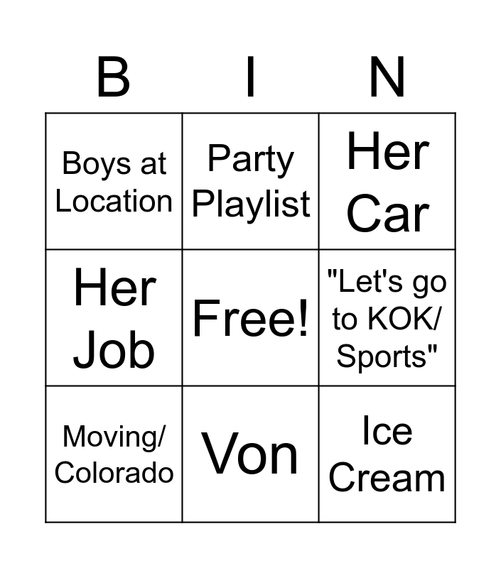 This bingo card has a free space and 10 words: Von, Her Car, Boys at Location, Ice Cream, Her Job, Moving/ Colorado, Party Playlist, Modeling, "Let's go to KOK/ Sports" and Remy.