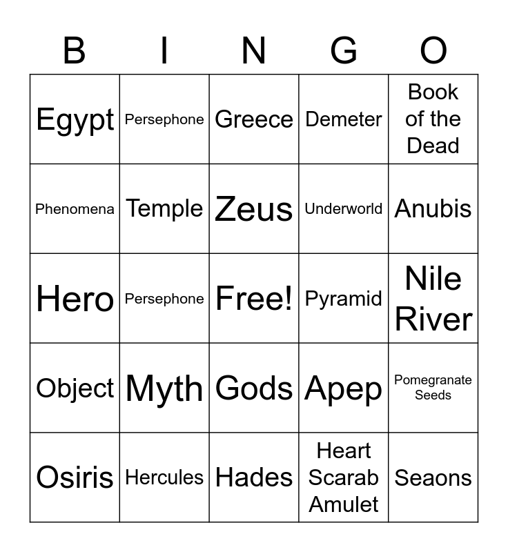This bingo card has a free space and 24 words: Myth, Hercules, Zeus, Osiris, Book of the Dead, Egypt, Phenomena, Persephone, Pyramid, Gods, Underworld, Hero, Apep, Pomegranate Seeds, Temple, Heart Scarab Amulet, Nile River, Greece, Anubis, Persephone, Seaons, Object, Demeter and Hades.