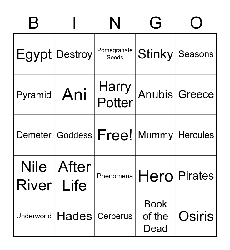 This bingo card has a free space and 29 words: Underworld, Zeus, Goddess, Persephone, Egypt, Pomegranate Seeds, Ani, After Life, Mummy, Hades, Hercules, Osiris, Cerberus, Book of the Dead, Greece, Object, Phenomena, Nile River, Seasons, Demeter, Hero, Apep, Anubis, Pyramid, Stinky, Destroy, Pirates, Harry Potter and Lamborghini.