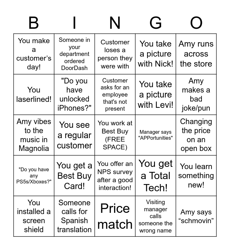 This bingo card has a free space and 34 words: Visiting manager sends a customer to the wrong department, Visiting manager calls someone the wrong name, Customer brings a pet, "Where are your fire sticks?", "Do you have any PS5s/Xboxes?", "Do you have unlocked iPhones?", Amy runs across the store, You installed a screen shield, Someone in your department ordered DoorDash, Someone needs an override in PAC, Customer asks for an employee that's not present, Customer loses a person they were with, Customer pays with a check, You find an abandoned shopping cart, Manager says "APPortunities", Amy makes a bad joke/pun, Someone calls for Spanish translation, Amy vibes to the music in Magnolia, You get a Best Buy Card!, You get a Total Tech!, You offer an NPS survey after a good interaction!, Not enough keys, You make a customer’s day!, Changing the price on an open box, Price match, Amy says “schmovin”, You take a picture with Nick!, You take a picture with Lexy!, You take a picture with Levi!, You laserlined!, You cleaned up your answer center!, You see a regular customer, You learn something new! and You have something unique in common with a customer.