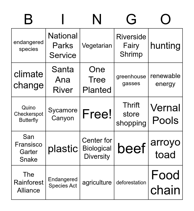 This bingo card has a free space and 32 words: deforestation, Joshua Tree, Sycamore Canyon, Recycling, San Fransisco Garter Snake, Santa Ana River, hunting, arroyo toad, National Parks Service, Pesticides, One Tree Planted, Vegetarian, World Wildlife Fund, Yellowstone Grizzly Bear, Thrift store shopping, Axolotl, invasive species, The Rainforest Alliance, Quino Checkerspot Butterfly, Center for Biological Diversity, plastic, beef, Ocean Conservancy, Vernal Pools, Endangered Species Act, Food chain, Riverside Fairy Shrimp, greenhouse gasses, climate change, endangered species, agriculture, carbon dioxide and renewable energy.
