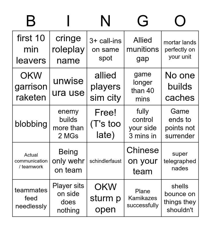 This bingo card has a free space and 25 words: Being only wehr on team, OKW sturm p open, allied players sim city, teammates feed needlessly, mortar lands perfectly on your unit, first 10 min leavers, OKW garrison raketen, cringe roleplay name, fully control your side 3 mins in, schindlerfaust, game longer than 40 mins, blobbing, Chinese on your team, super telegraphed nades, unwise ura use, Tank insta dies to shoulder-fired, Game ends to points not surrender, 3+ call-ins on same spot, No one builds caches, enemy builds more than 2 MGs, shells bounce on things they shouldn't, Player sits on side does nothing, Actual communication / teamwork, Allied munitions gap and Plane Kamikazes successfully.
