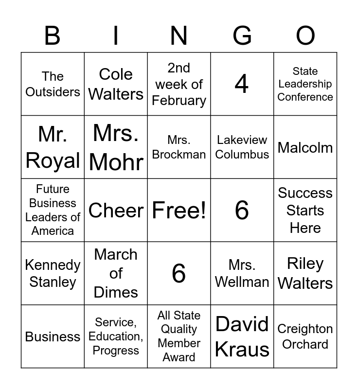 This bingo card has a free space and 29 words: Business, 8, Cheer, Mrs. Pester, The Outsiders, 2nd week of February, Mrs. Mohr, March of Dimes, 6, Service, Education, Progress, Success Starts Here, Creighton Orchard, All State Quality Member Award, David Kraus, Malcolm, Megan Wallman, 6, Kennedy Stanley, State Leadership Conference, Future Business Leaders of America, Mrs. Wellman, Mrs. Watermeier, Lakeview Columbus, Mr. Royal, 4, Cole Walters, Riley Walters, Mrs. Brockman and 3.