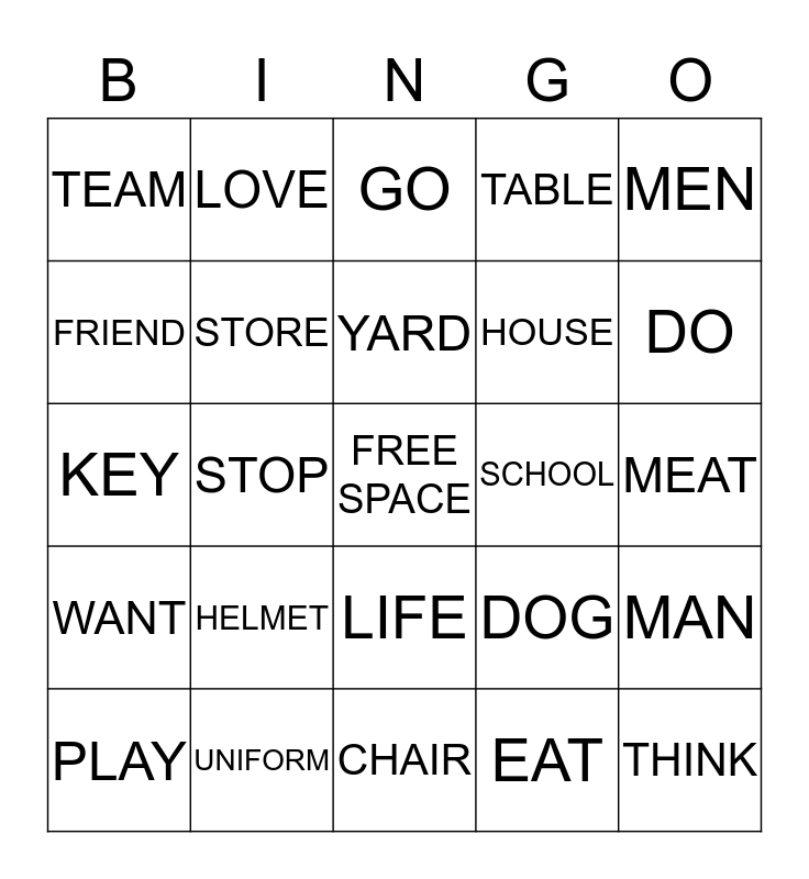 This bingo card has a free space and 24 words: HELMET, UNIFORM, YARD, PLAY, MEN, TEAM, FRIEND, LOVE, SCHOOL, LIFE, HOUSE, KEY, DOG, MAN, STORE, EAT, MEAT, GO, DO, STOP, THINK, WANT, TABLE and CHAIR.