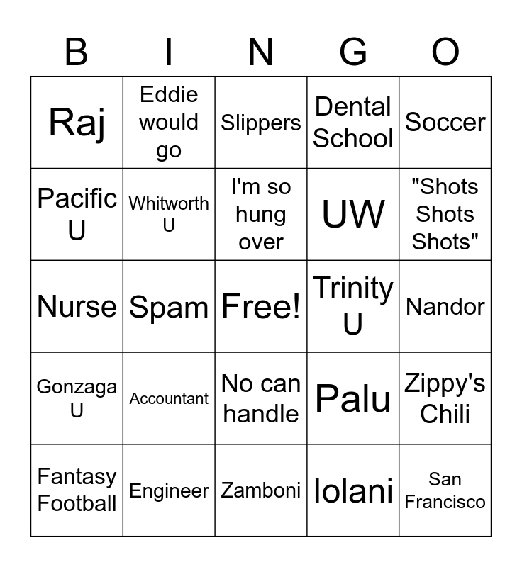 This bingo card has a free space and 34 words: Punahou, Iolani, Seattle U, U of Portland, Gonzaga U, Whitworth U, Soccer, Fantasy Football, Eddie would go, "Can Archie eat ***?", I'm so hung over, Slippers, Shoots, Apex, Trinity U, "Shots Shots Shots", Engineer, Nurse, Accountant, Palu, No can handle, Welcome to Jurassic Park, Raj, Nandor, Zamboni, San Francisco, Dental School, Optometry School, UW, Pacific U, Wedding, Spam, Zippy's Chili and Colorado.
