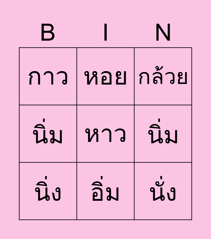 This bingo card has a free space and 11 words: กิน, วง, นิ่ม, นิ่ง, กล้วย, กาว, อิ่ม, นอน, นิ่ม, หอย and นั่ง.