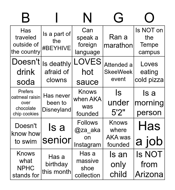 This bingo card has 25 words: Is a senior, Has a massive shoe collection, LOVES hot sauce, Knows what NPHC stands for, Is NOT on the Tempe campus, Has traveled outside of the country, Doesn't drink soda, Is a part of the #BEYHIVE, Is under 5'2", Follows @za_aka on Instagram, Attended a SkeeWeek event, Prefers oatmeal raisin over chocolate chip cookies, Knows where AKA was founded, Has a job, Is deathly afraid of clowns, Is NOT from Arizona, Is a morning person, Can speak a foreign language, Loves eating cold pizza, Has never been to Disneyland, Knows when AKA was founded, Has a birthday this month, Doesn't know how to swim, Ran a marathon and Is an only child.