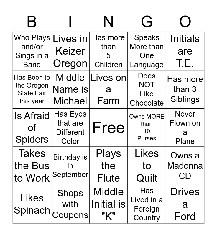 This bingo card has a free space and 24 words: Birthday is In September, Shops with Coupons, Lives on a Farm, Likes Spinach, Initials are T.E., Who Plays and/or Sings in a Band, Has Been to the Oregon State Fair this year, Lives in Keizer Oregon, Owns MORE than 10 Purses, Plays the Flute, Does NOT Like Chocolate, Is Afraid of Spiders, Likes to Quilt, Owns a Madonna CD, Middle Name is Michael, Has Lived in a Foreign Country, Never Flown on a Plane, Has more than 5 Children, Has more than 3 Siblings, Has Eyes that are Different Color, Drives a Ford, Takes the Bus to Work, Speaks More than One Language and Middle Initial is "K".