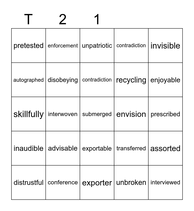 This bingo card has a free space and 24 words: advisable, conference, contradiction, distrustful, invisible, pretested, autographed, enforcement, envision, exportable, recycling, skillfully, transferred, assorted, disobeying, unbroken, prescribed, unpatriotic, enjoyable, interwoven, interviewed, inaudible, contradiction and exporter.