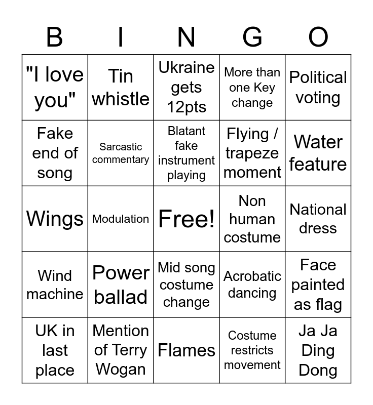 This bingo card has 40 words: Smoke machine, Wings, Glitter cannon, Sarcastic commentary, Mention of Terry Wogan, Mid song costume change, Blatant fake instrument playing, Greece & Cyprus give 12pts to each other, Political voting, Wind machine, Modulation, More than one Key change, Free!, National dress, Non human costume, Power ballad, Pyrotechnics, "I love you", Heart gesture, Ukraine gets 12pts, Face painted as flag, Costume restricts movement, Flying / trapeze moment, Fake end of song, Big drums on stage, Fur or feathers on outfit, Person sings during scores, Reference to Eurovision movie, Ja Ja Ding Dong, Presenter outfit change, Mention Australia, UK in last place, UK gets a point, Acrobatic dancing, Water feature, Flames, Romans, Violins, Tin whistle and Off key singing.