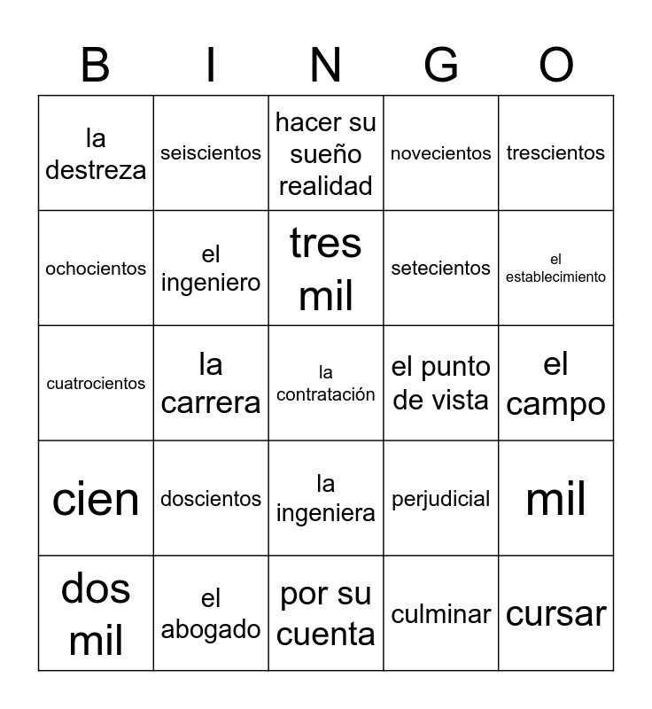 This bingo card has 30 words: el abogado, la abogada, la carrera, me convierto, la destreza, hacer su sueño realidad, el ingeniero, la ingeniera, el punto de vista, por su cuenta, el campo, la contratación, culminar, cursar, el establecimiento, la jornada, perjudicial, cien, doscientos, trescientos, cuatrocientos, quinientos, seiscientos, setecientos, ochocientos, novecientos, mil, dos mil, tres mil and cuatro mil.