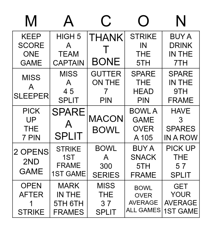This bingo card has a free space and 24 words: STRIKE 1ST FRAME 1ST GAME, MARK IN THE 5TH 6TH FRAMES, GUTTER ON THE 7 PIN, OPEN AFTER 1 STRIKE, BUY A DRINK IN THE 7TH, KEEP SCORE ONE GAME, MISS A SLEEPER, HIGH 5 A TEAM CAPTAIN, BOWL A GAME OVER A 105, BOWL A 300 SERIES, SPARE THE HEAD PIN, PICK UP THE 7 PIN, BUY A SNACK 5TH FRAME, PICK UP THE 5 7 SPLIT, MISS A 4 5 SPLIT, BOWL OVER AVERAGE ALL GAMES, HAVE 3 SPARES IN A ROW, THANK T BONE, SPARE IN THE 9TH FRAME, SPARE A SPLIT, GET YOUR AVERAGE 1ST GAME, 2 OPENS 2ND GAME, STRIKE IN THE 5TH and MISS THE 3 7 SPLIT.