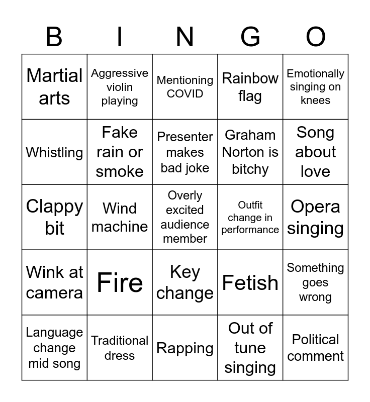 This bingo card has 26 words: Key change, Out of tune singing, Presenter makes bad joke, Traditional dress, Emotionally singing on knees, Martial arts, Whistling, Aggressive violin playing, Opera singing, Fetish, Graham Norton is bitchy, Clappy bit, Something goes wrong, Language change mid song, Wind machine, Anyone crying, Rainbow flag, Wink at camera, Mentioning COVID, Overly excited audience member, Song about love, Rapping, Outfit change in performance, Fire, Fake rain or smoke and Political comment.