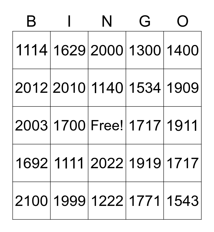 This bingo card has a free space and 24 words: 1111, 1999, 1140, 2100, 1400, 1114, 2012, 1629, 1717, 2022, 1534, 2003, 1919, 1717, 2010, 1771, 1911, 2000, 1909, 1700, 1543, 1692, 1300 and 1222.