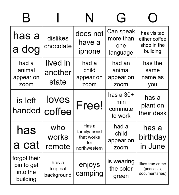 This bingo card has a free space and 24 words: who works remote, has a tropical background, had a child appear on zoom, forgot their pin to get into the building, has visited either coffee shop in the building, has a a dog, had a animal appear on zoom, dislikes chocolate, has a 30+ min commute to work, Has a family/friend that works for northwestern, had an animal appear on zoom, is left handed, had a child appear on zoom, has a birthday in June, lived in another state, is wearing the color green, has a plant on their desk, does not have a iphone, has the same name as you, loves coffee, likes true crime (podcasts, documentaries), has a cat, Can speak more than one language and enjoys camping.