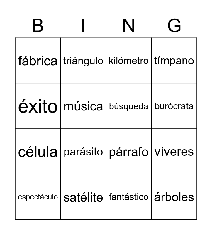 This bingo card has 16 words: satélite, víveres, kilómetro, fábrica, célula, triángulo, párrafo, fantástico, éxito, música, espectáculo, tímpano, parásito, burócrata, búsqueda and árboles.