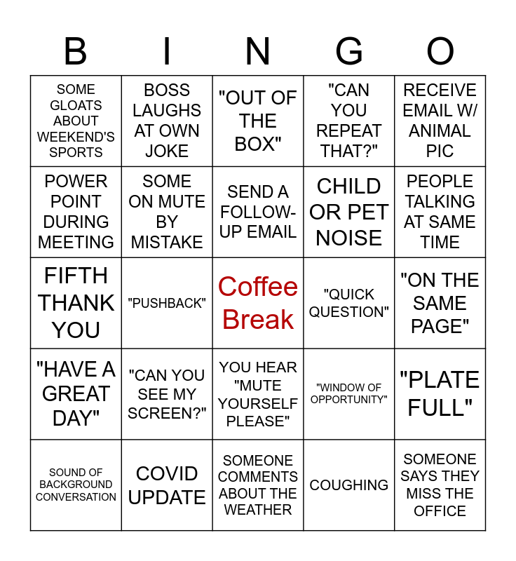 This bingo card has a free space and 24 words: "CAN YOU SEE MY SCREEN?", COVID UPDATE, SEND A FOLLOW-UP EMAIL, SOUND OF BACKGROUND CONVERSATION, RECEIVE EMAIL W/ ANIMAL PIC, SOME GLOATS ABOUT WEEKEND'S SPORTS, POWER POINT DURING MEETING, BOSS LAUGHS AT OWN JOKE, "QUICK QUESTION", YOU HEAR "MUTE YOURSELF PLEASE", CHILD OR PET NOISE, FIFTH THANK YOU, "WINDOW OF OPPORTUNITY", "PLATE FULL", SOME ON MUTE BY MISTAKE, COUGHING, "ON THE SAME PAGE", "OUT OF THE BOX", PEOPLE TALKING AT SAME TIME, "PUSHBACK", SOMEONE SAYS THEY MISS THE OFFICE, "HAVE A GREAT DAY", "CAN YOU REPEAT THAT?" and SOMEONE COMMENTS ABOUT THE WEATHER.