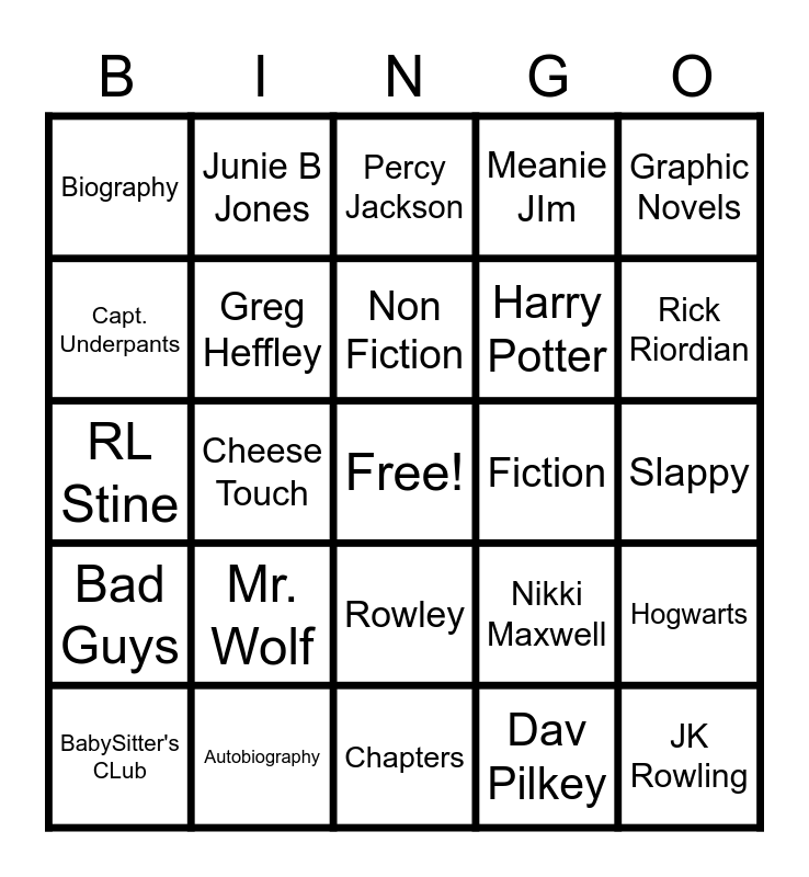 This bingo card has a free space and 24 words: Mr. Wolf, Autobiography, Non Fiction, BabySitter's CLub, Graphic Novels, Biography, Capt. Underpants, Junie B Jones, Fiction, Rowley, Harry Potter, RL Stine, Nikki Maxwell, Hogwarts, Greg Heffley, Dav Pilkey, Slappy, Percy Jackson, Rick Riordian, Cheese Touch, JK Rowling, Bad Guys, Meanie JIm and Chapters.