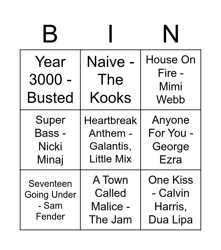 This bingo card has a free space and 8 words: Anyone For You - George Ezra, House On Fire - Mimi Webb, Naive - The Kooks, Seventeen Going Under - Sam Fender, Year 3000 - Busted, One Kiss - Calvin Harris, Dua Lipa, Super Bass - Nicki Minaj and A Town Called Malice - The Jam.