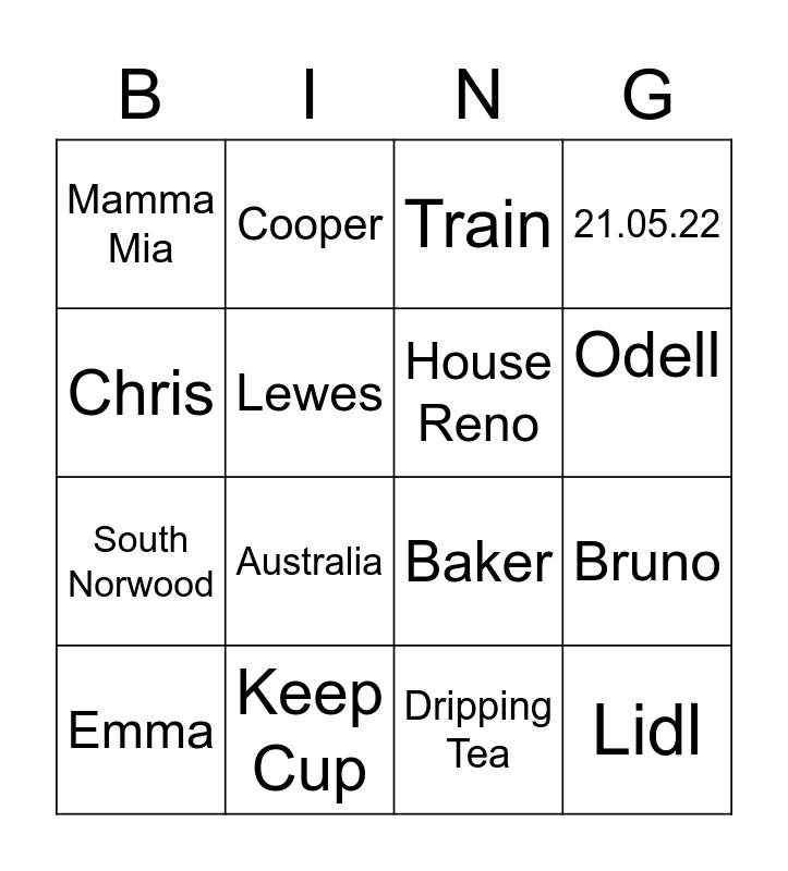 This bingo card has 20 words: Bruno, Chester, Train, Higham's Park, Emma, Chris, Keep Cup, Mamma Mia, South Norwood, Cooper, Australia, Baker, Lewes, Lidl, House Reno, Ginger, Odell, 21.05.22, Dripping Tea and REUSABLE THINGS PLEASE.
