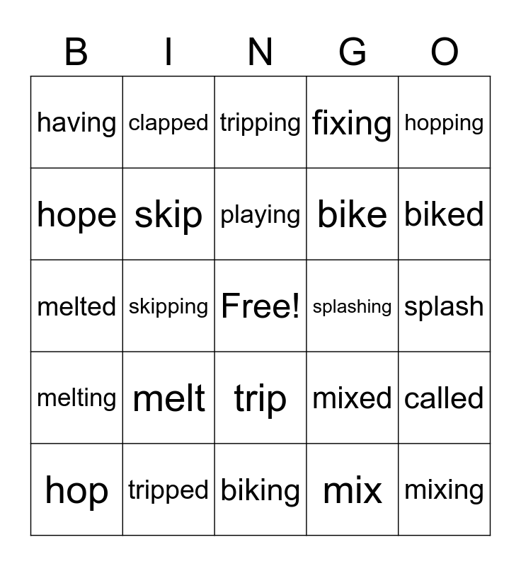 This bingo card has a free space and 29 words: hop, run, skipping, hoped, having, tripping, skip, melt, splashing, tripped, splash, mixing, biking, mix, biked, splashed, trip, melting, hopping, melted, mixed, hopped, bike, hope, fixing, clapped, called, playing and play.